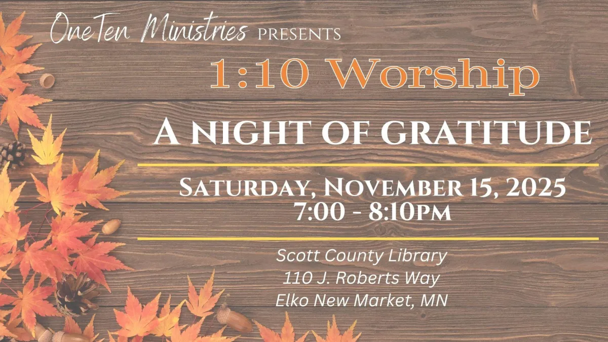 Join us for our next 1:10 Worship and Prayer Gathering! This is one hour and ten minutes of intentional worship and prayer. We will also offer communion for those interested. The theme for this event is gratitude!